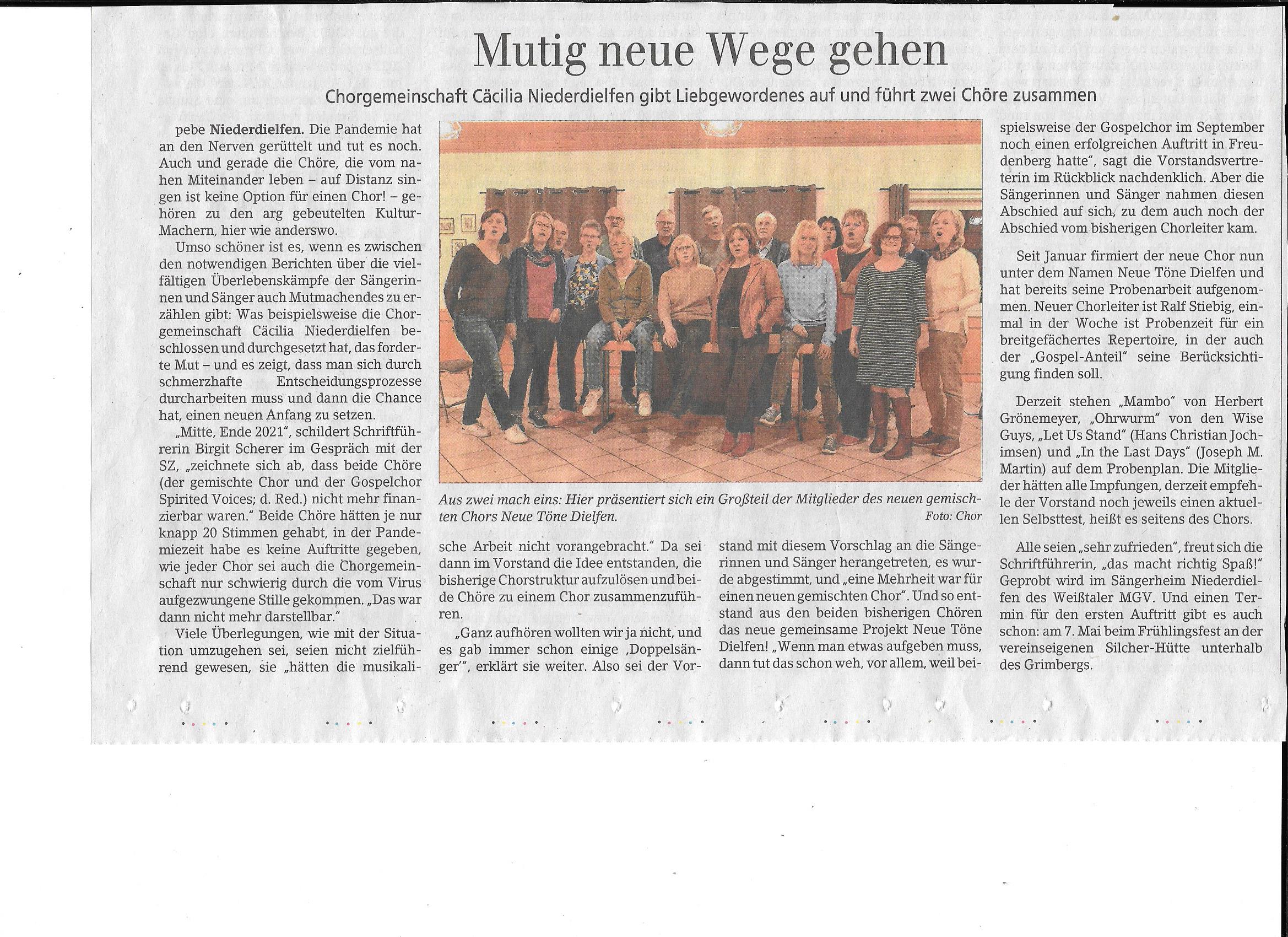 Wir begrüßen Sie bei der Chorgemeinschaft Cäcilia Niederdielfen e.V.